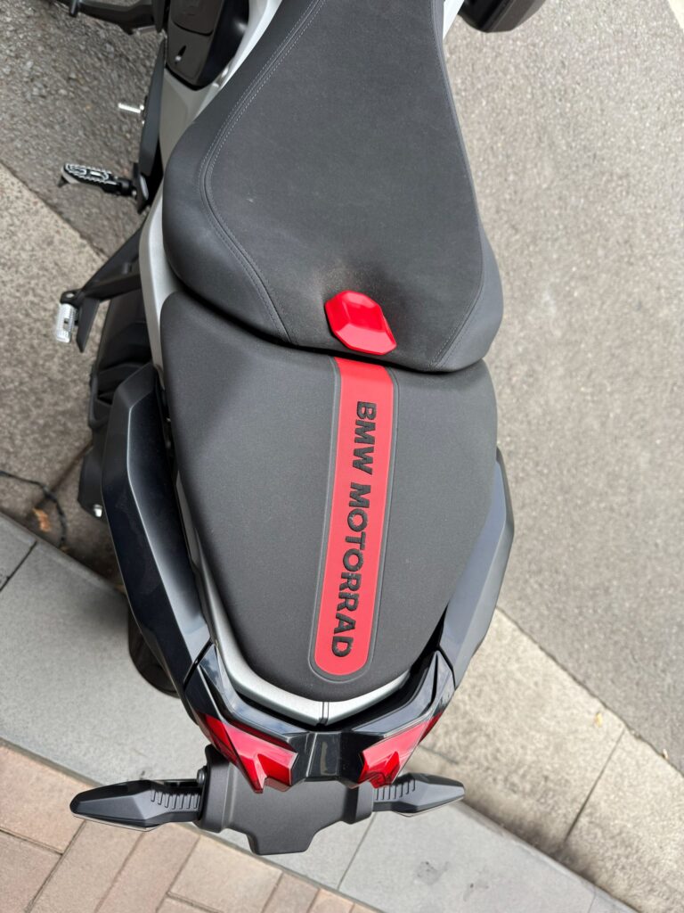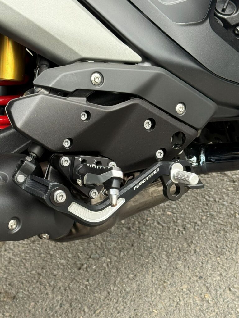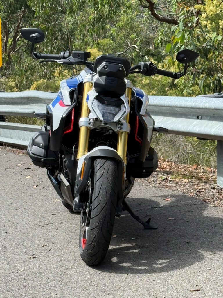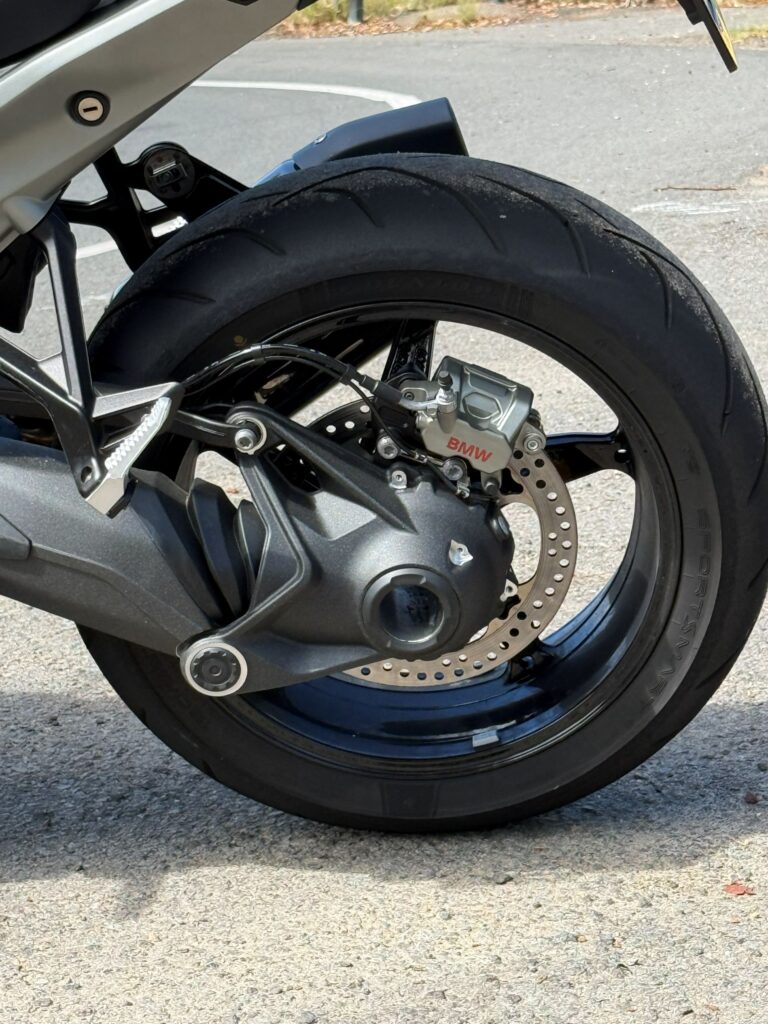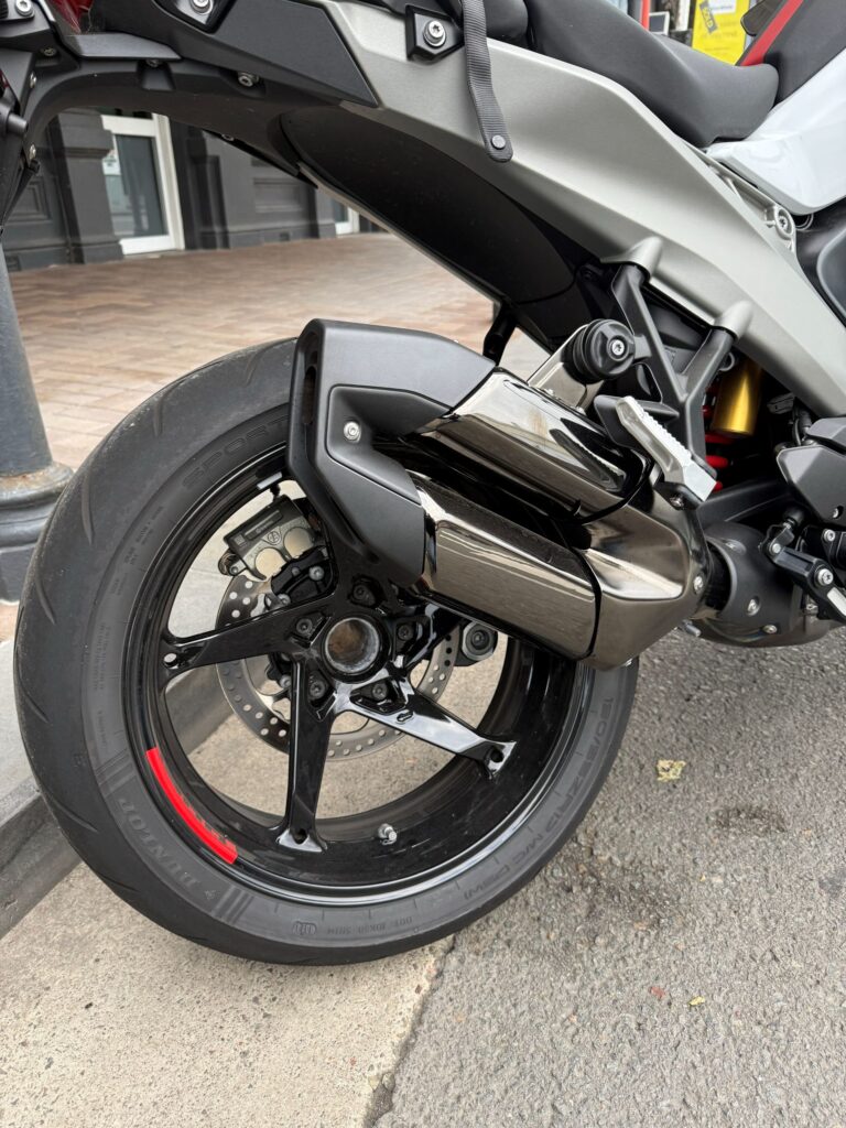 I had the Performance variant. This meant it came with heated seats and grips, tyre pressure monitoring, luggage system prep, hill start control, Brembos, sportier suspension, stupid-sticky Dunlop SportSmart rubber, a pro headlight kit that will light up corners for you, bar-end mirrors, and a bunch of bling like the cool new exhaust can in black chrome, flash wheels, and sports seats for you and your pillion. The only model more special than this is the Option 719 variant.