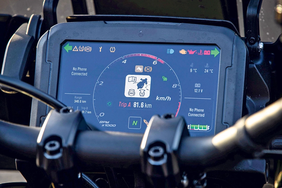 Your happiness is also addressed. There be 150 horses and 128Nm of torque in the Revolution Max engine. It’s 263kg wet, and the seat sits less than 850-feet-flat-on-the-ground-mm when you’re at a standstill, thanks to its brilliant automatic adaptive height system. I loved this feature from the get-go. A bike that automatically lowers itself when you’re coming to a stop, then raises itself up when you ride off? Yes, please. The other brands all started playing catch-up on their adventure bikes after that, just as I said they would.