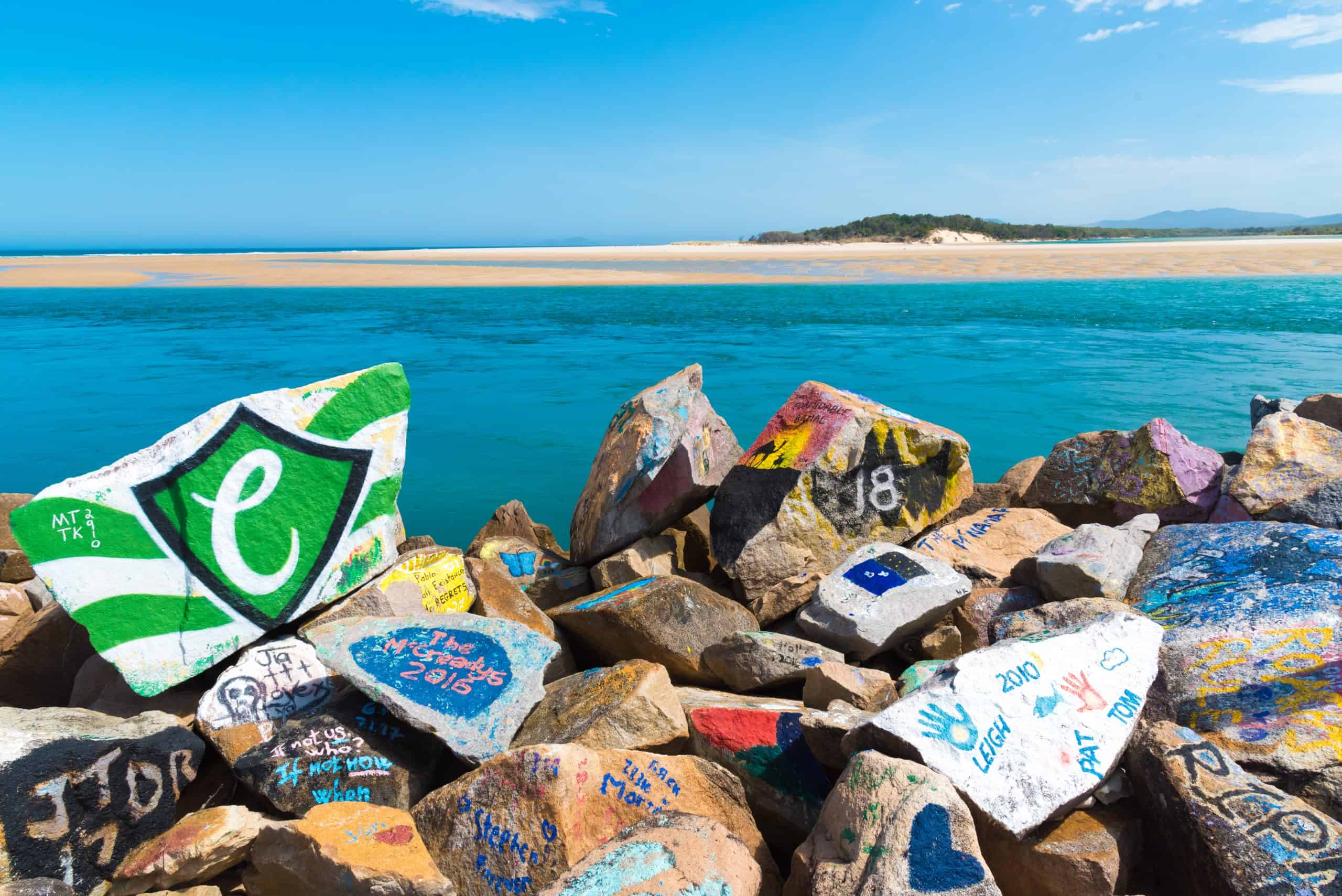 “Over the years many visitors have painted their holiday messages, inspirational words, and memories on the rocks at the V-Wall Nambucca Heads. Stroll or wheel along the break wall at the end of Wellington Drive and see what it’s all about. This creative space provides a great read with comments from locals as well as visitors from around Australia and across the globe.”